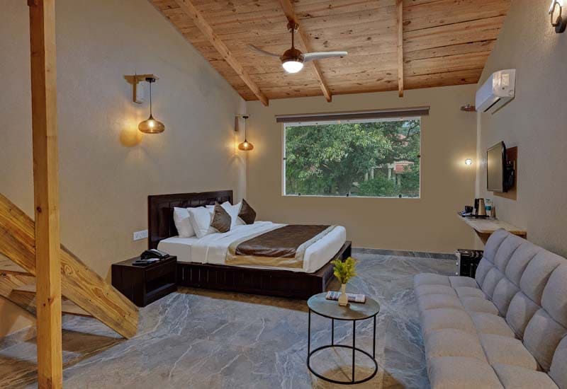 Sarang Family Rooms has a king-size bed and a Machan for kids. A balcony or a sit-out area with an option of having a garden view room. The Sarang Family Room showcases distinct blended aspects of modern artistry balanced by necessary home comforts and conveniences.